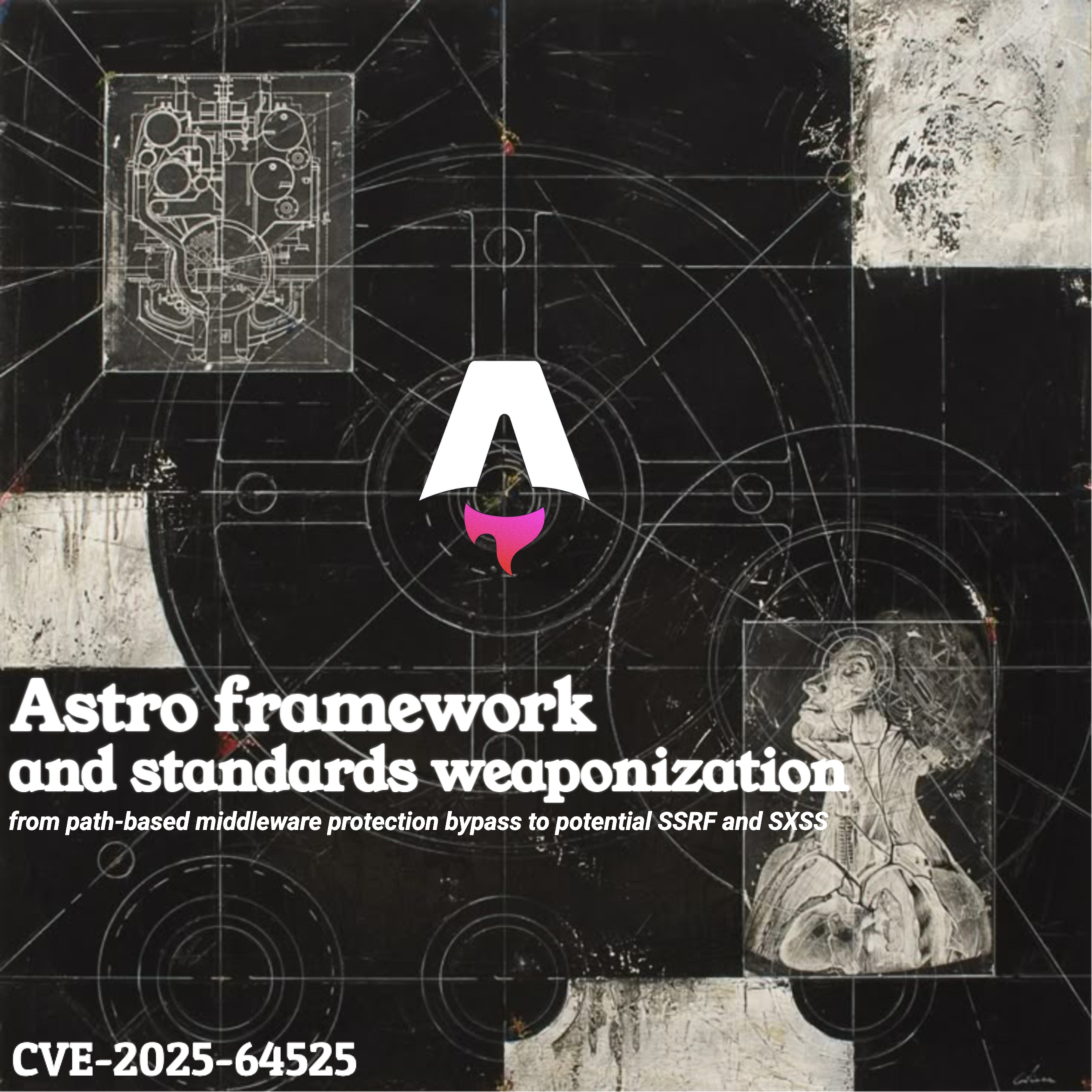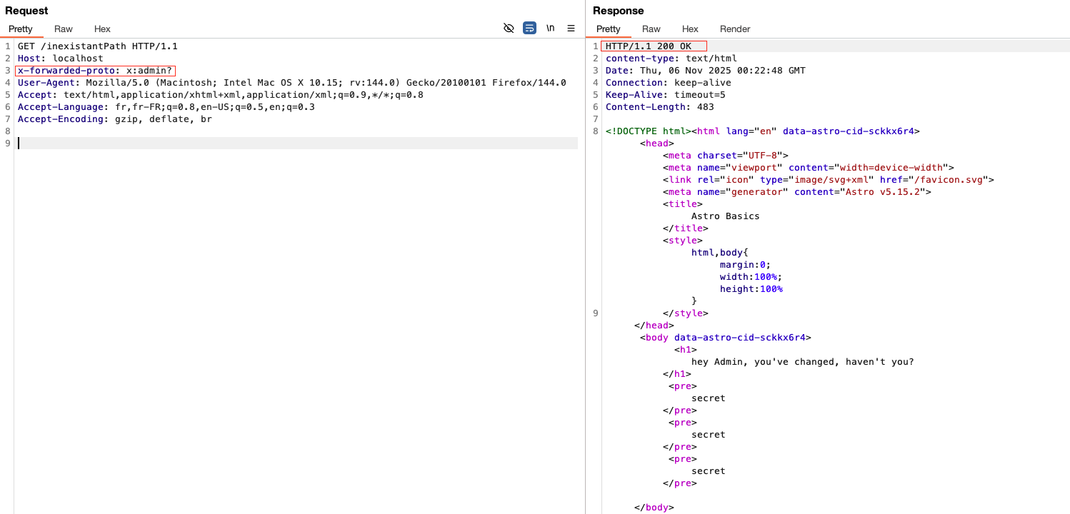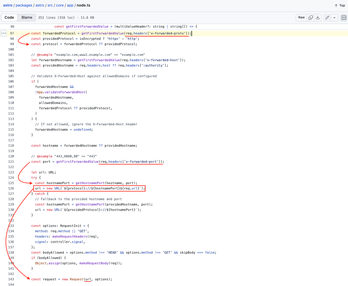 A template literals, with three values: one for the protocol, one for the hostname + port, and the other for the path. Astro’s security advisories indicate that a vulnerability (CVE-2025-61925) was discovered last month involving the x-forwarded-host request header (quite similar to our previous research on react-router/remix), the latter being used without validation to construct the URL above, allowing the hostname to be spoofed and leading to multiple vulnerabilities. We were able to completely bypass the CVE patch in question, as we will see later in this paper.
