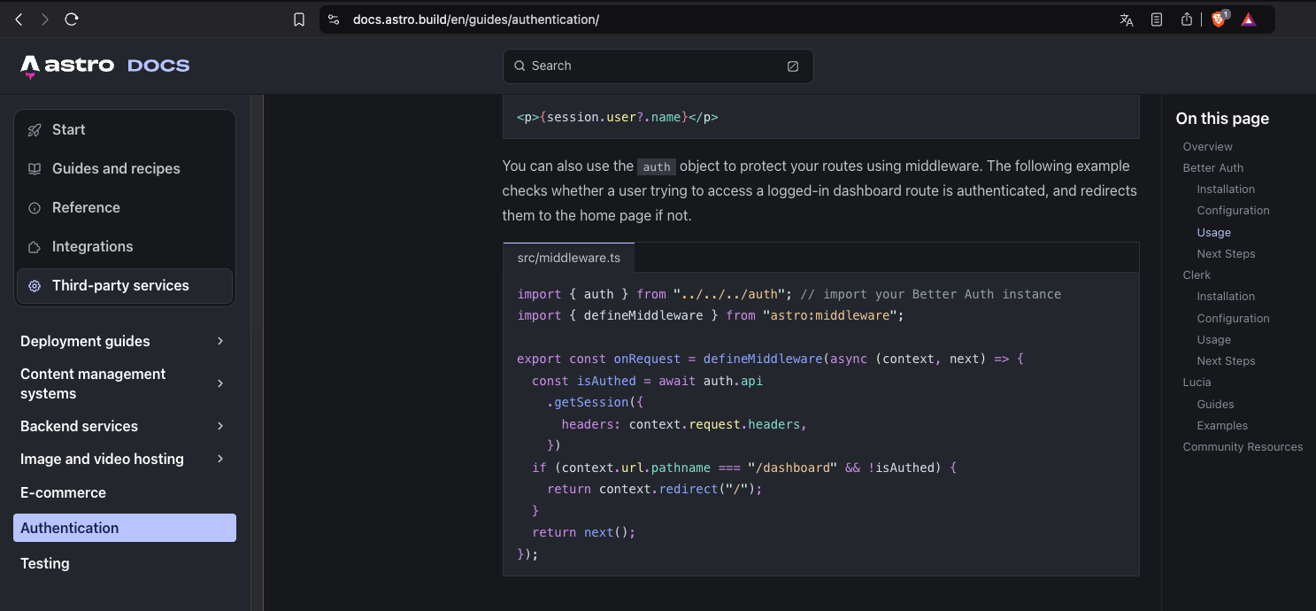 We will base our middleware on the developers’ source of truth, the official Astro documentation and use the following snippet to protect our /admin route: