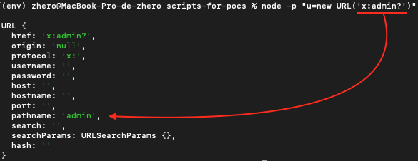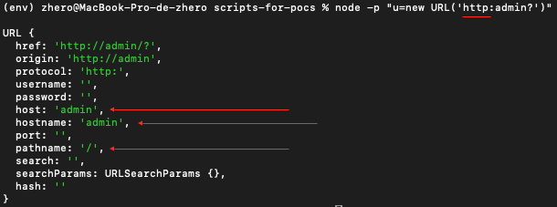 However, in the example below, we see that the same payload, using the http scheme, appears to use admin as the host and automatically adding / as a pathname, which may seem, at first glance, to contradict what we observed earlier :